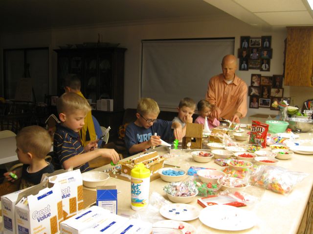 At the beginning of December the Hendersons got together to decorate gingerbread houses.  I am grateful that my mom has a HUGE kitchen, it makes this project so much easier when you have 11 kids trying to decorate their own houses.